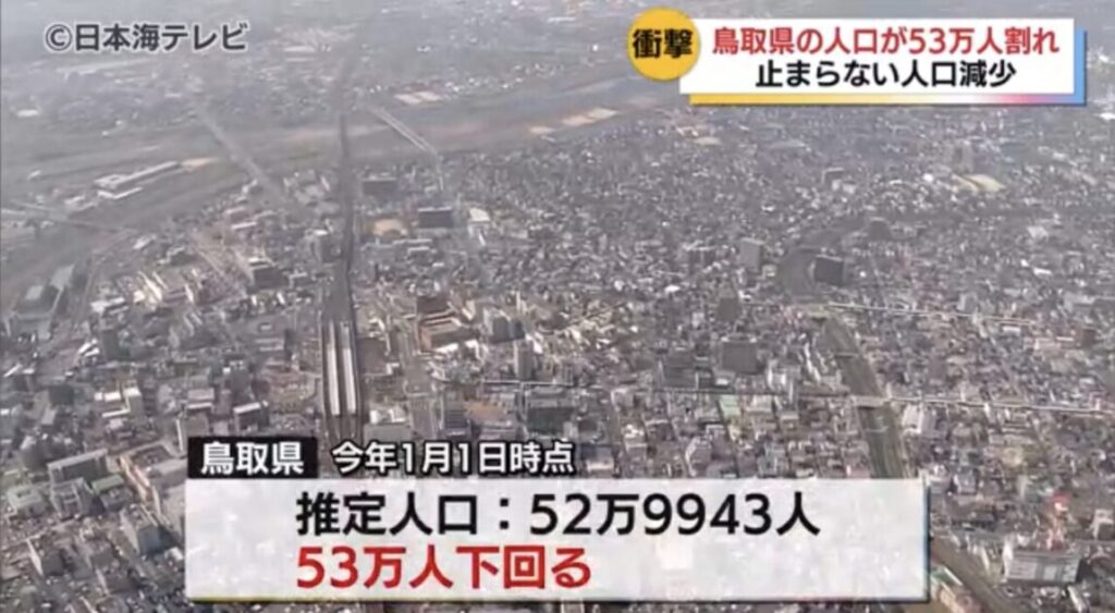 1: 首都圏の虎 ★ 2025/01/20(月) 21:23:05.77 ID:ZYUPKkPW9 鳥取県の人口が53万人を割り込んだことが分かりました。鳥取県内では1996年以降、人口減少が続き、戦後最少となりました。国立社会保障・人口問題研究所の推計では2050年には40万人余りまで人口... -