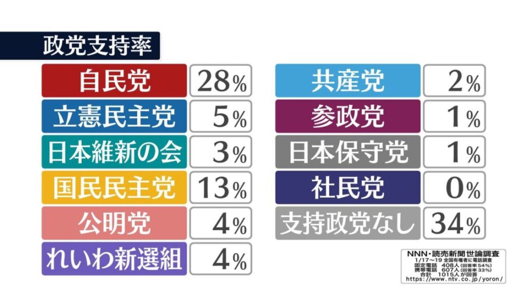 政党支持率 自民28%(+4) 国民民主13% 立憲5%(-3) 【NNN・読売新聞 世論調査】