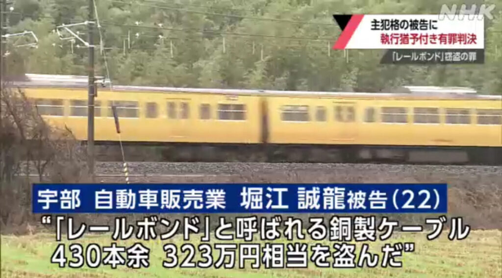 1: 少考さん ★ 2025/01/10(金) 21:49:02.99 ID:AsoETpFV9 線路の銅製ケーブル窃盗 ”主犯格”に執行猶予付きの有罪判決|NHK 山口県のニュース https://www3.nhk.or.jp/lnews/yamaguchi/20250110/4060022146.html01月10日 13時39分 JRの線路のつなぎ目に... -