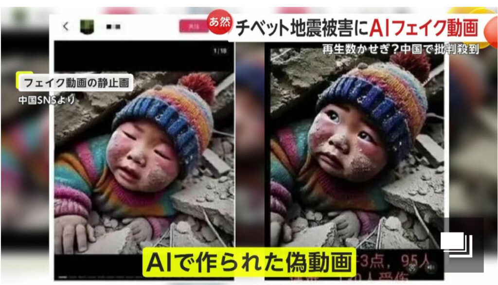 1: 朝一から閉店までφ ★ 2025/01/10(金) 23:07:17.53 ID:??? TID:syoubainin イット! 2025年1月10日 金曜 午後8:007日に発生した中国・チベット自治区の地震をめぐり、SNSで拡散された子どもががれきに埋まる動画は、AIで作られたフェイク動画だと判明し... -