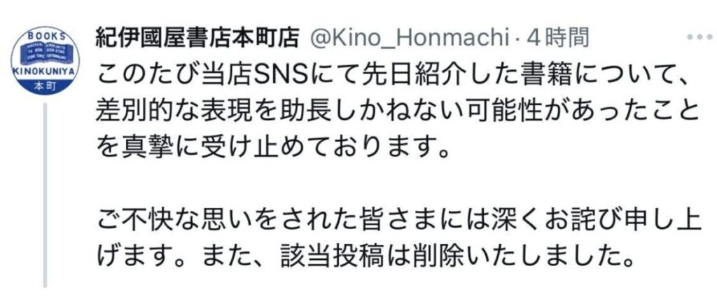 紀伊國屋書店が謝罪「差別的な表現を助長しかねない」大阪の店舗が書籍紹介→投稿削除