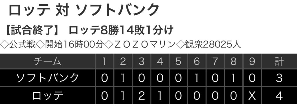 1: 鉄チーズ烏 ★ 2025/08/31(日) 19:17:37.26 ID:Ieji0dA09 ソフトバンク 0 1 0 0 0 1 0 1 0|3 ロッテ 0 1 2 1 0 0 0 0 x|4 【バッテリー】 (ソ)松本晴、尾形、木村光、上茶谷、大江 - 嶺井、谷川原 (ロ... -