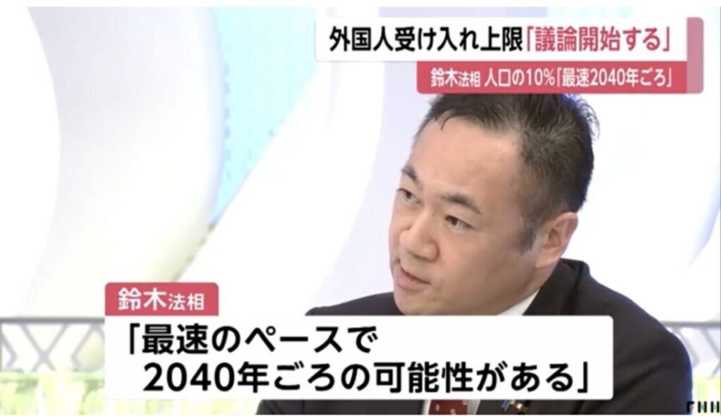 【法務省】鈴木法相、外国人比率が10%台に到達する時期について、「最速のペースで2040年ごろで、かなり前倒しの可能性がある」