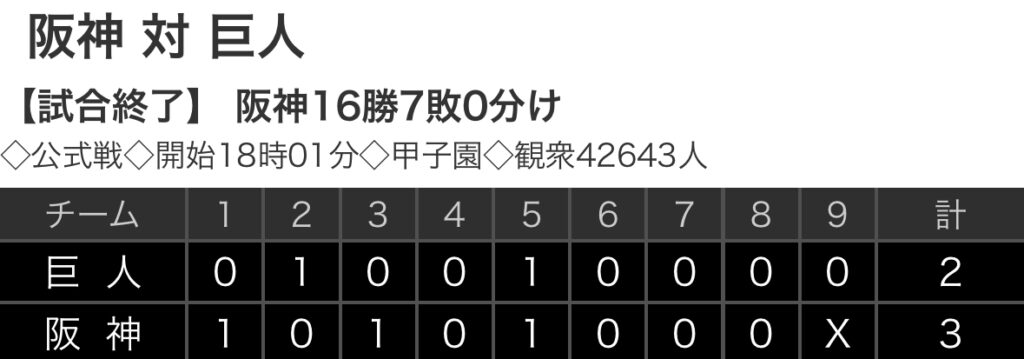 1: 鉄チーズ烏 ★ 2025/08/30(土) 21:55:22.79 ID:Z4hIbqcM9 巨人 0 1 0 0 1 0 0 0 0 |2 阪神 1 0 1 0 1 0 0 0 x |3 【バッテリー】 (巨)井上、船迫、ケラー、田中瑛、宮原 - 岸田 (阪)高橋、ドリス、及川、石井、...