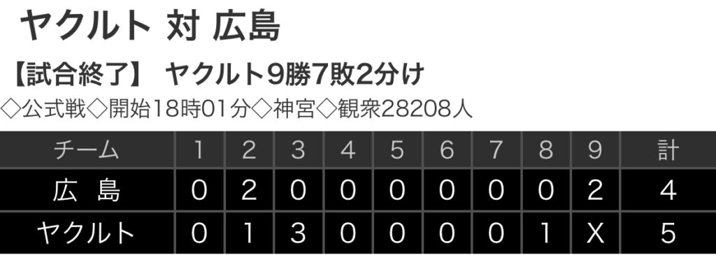 1: 鉄チーズ烏 ★ 2025/08/30(土) 20:54:39.55 ID:Z4hIbqcM9 広島 0 2 0 0 0 0 0 0 2 |4 ヤクルト 0 1 3 0 0 0 0 1 x |5 【バッテリー】 (広)高橋、鈴木、中﨑、岡本、辻 - 坂倉 (ヤ)山野、矢崎、大西、星 - ... -