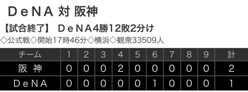 1: 鉄チーズ烏 ★ 2025/08/27(水) 21:01:01.02 ID:WDV1okEX9 阪神 0 0 0 2 0 0 0 0 0 |2 DeNA 0 0 0 0 0 1 0 0 0 |1 【バッテリー】 (阪) 早川、岡留、ドリス、岩崎 - 梅野 (De)東、宮城、森原 - 山本、... -