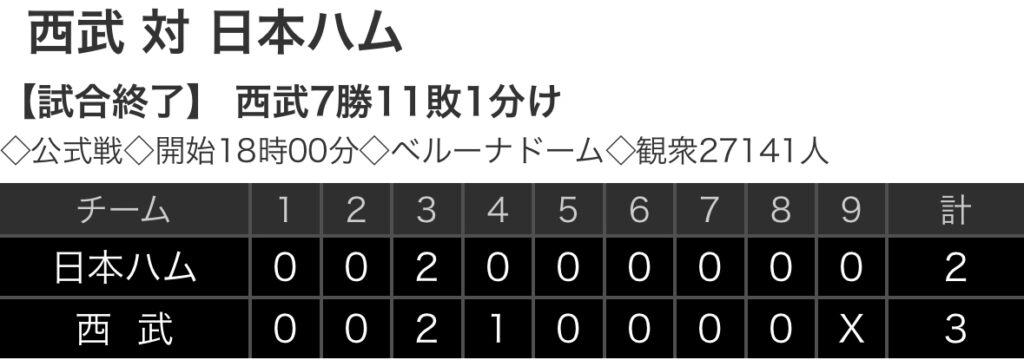1: 鉄チーズ烏 ★ 2025/08/27(水) 21:15:53.26 ID:WDV1okEX9 日本ハム 0 0 2 0 0 0 0 0 0|2 西武. 0 0 2 1 0 0 0 0 x|3 【バッテリー】 (日)山﨑福也、生田目、金村、齋藤 - 伏見、田宮 (西)與座、ウィンゲ... -