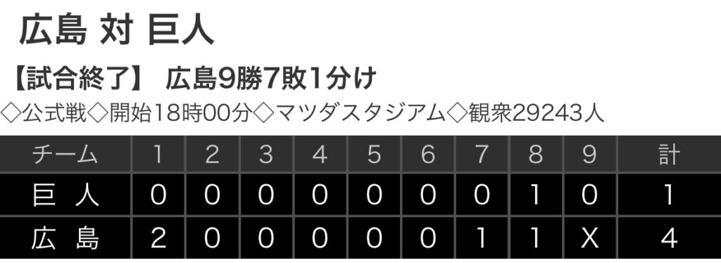 1: 鉄チーズ烏 ★ 2025/08/27(水) 21:58:12.94 ID:WDV1okEX9 巨人 0 0 0 0 0 2 0 0 0 |2 広島 0 0 0 0 3 0 0 0 x |3 【バッテリー】 (巨)森田、船迫、ケラー、田中瑛、中川 - 岸田 (広)大瀬良、栗林、島内、森浦 -... -