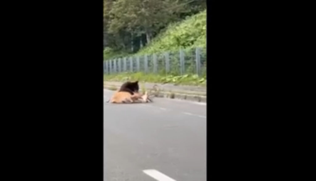【ヒグマ速報】車道でヒグマがエゾシカの首元をくわえ林の方へ引きずっていくのを視聴者が撮影 北海道・羅臼町