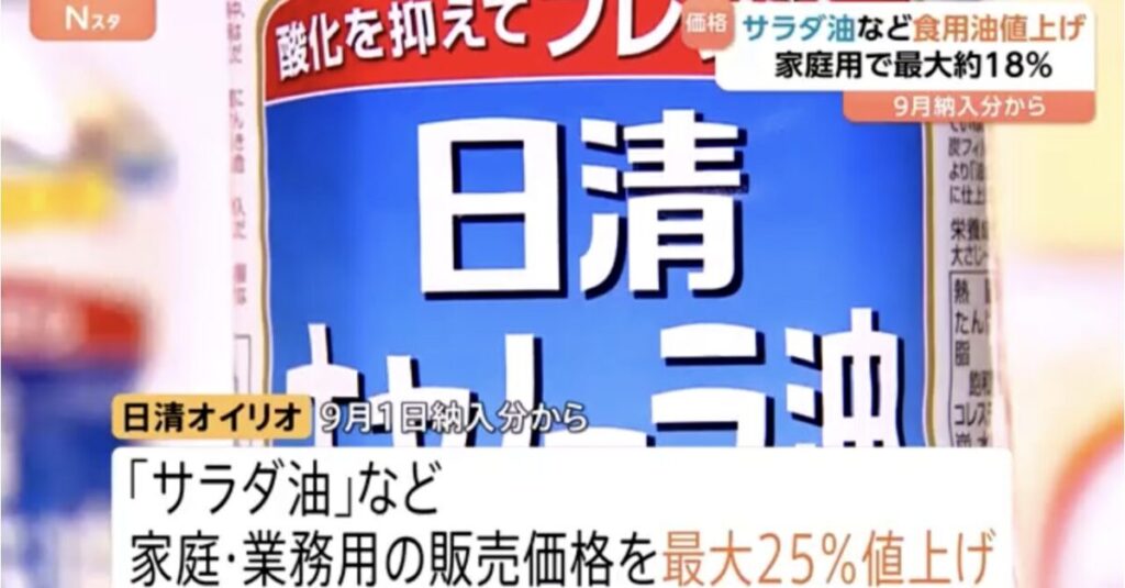 【企業】サラダ油・キャノーラ油など家庭用食用油 最大18%値上げ 日清オイリオ9月納品分から