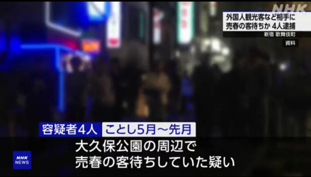 1: ぐれ ★ 2025/07/24(木) 21:15:46.56 ID:BtSczKPq9 >>2025年7月24日 13時08分 NHK 東京 新宿区歌舞伎町で外国人観光客などを相手に売○目的で客待ちをしたとして、20代の女の容疑者4人が警視庁に逮捕されました。容疑者の1人は「私服警察官ではない... -