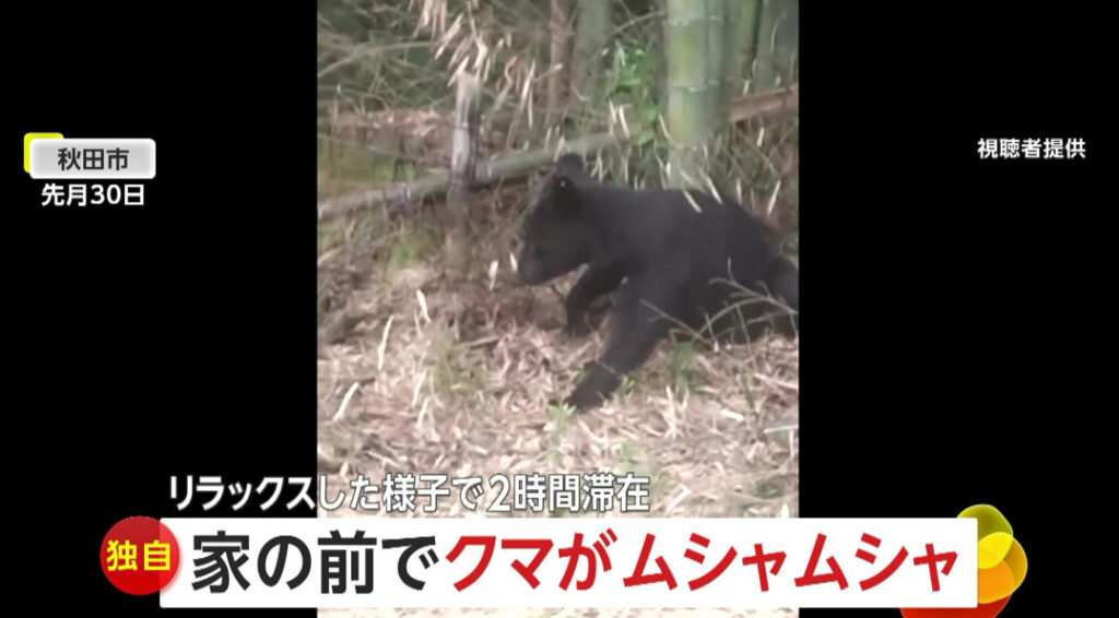 【秋田市】「びっくり!」自宅前で子グマが「ムシャムシャ」食事し横になるリラックスモードで2時間滞在…追い払うも「また来るかも」