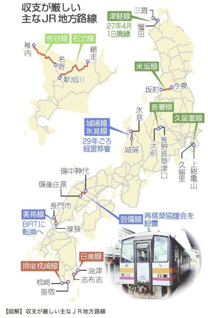 芸備線以外はJR各社と地元が協議する。北海道は石北線など8線区について、地元負担による存続に向けて議論。東日本は大雨被害で運休している米坂線の坂町―今泉など4線区、西日本は芸備線以外に6線区、九州は日南線の油津―志布志など2線区で、各沿線の実情を踏まえて話し合いを続ける。