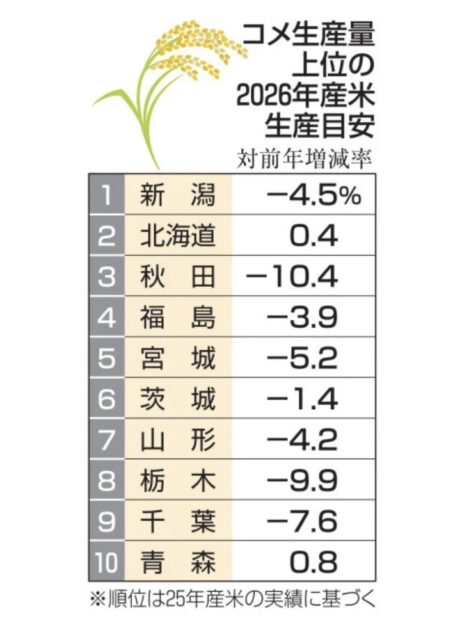 産地ごとの生産目安は、自治体や地域の農業協同組合(JA)などでつくる農業団体が決めている。10道県のうち、秋田、新潟両県のほか宮城県が5.2%減、山形県が4.2%減、福島県が3.9%減、茨城県が1.4%減、栃木県が9.9%減、千葉県が7.6%減。北海道と青森県はほぼ横ばい。