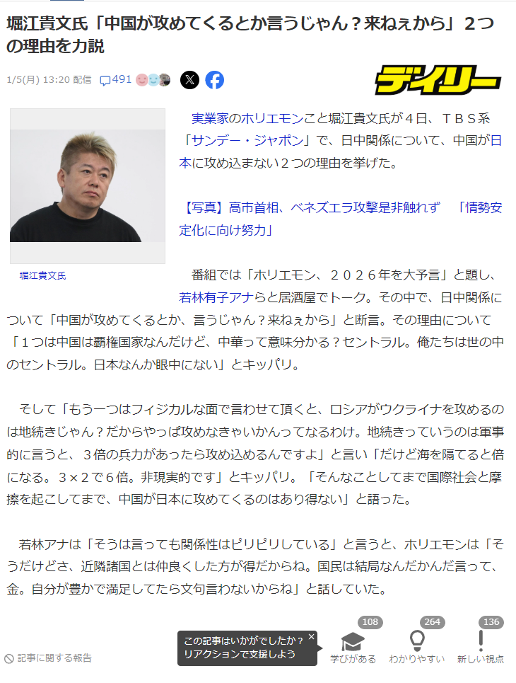 引用元: ・【正論】ホリエモン「中国が攻めてくるとか言うじゃん?来ねぇから!日本なんて眼中にない」 [668024367]