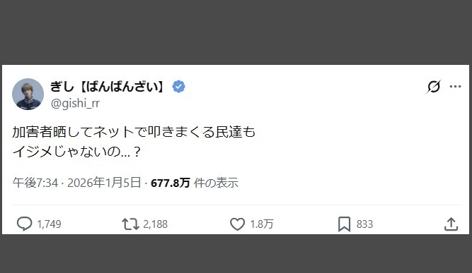 人気ユーチューバー、ばんばんざいのぎしが6日までに自身のX(旧ツイッター)を更新。SNS上で加害者を晒す動きに対し、私見を述べた。