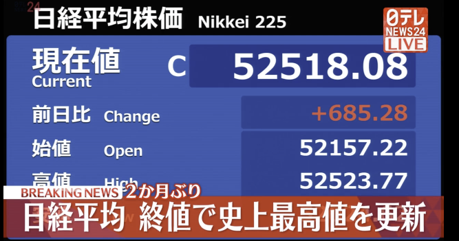日テレNEWS NNN6日の東京株式市場で日経平均株価の終値は、52518円8銭で昨年10月31日以来、およそ2か月ぶりに最高値を更新しました。