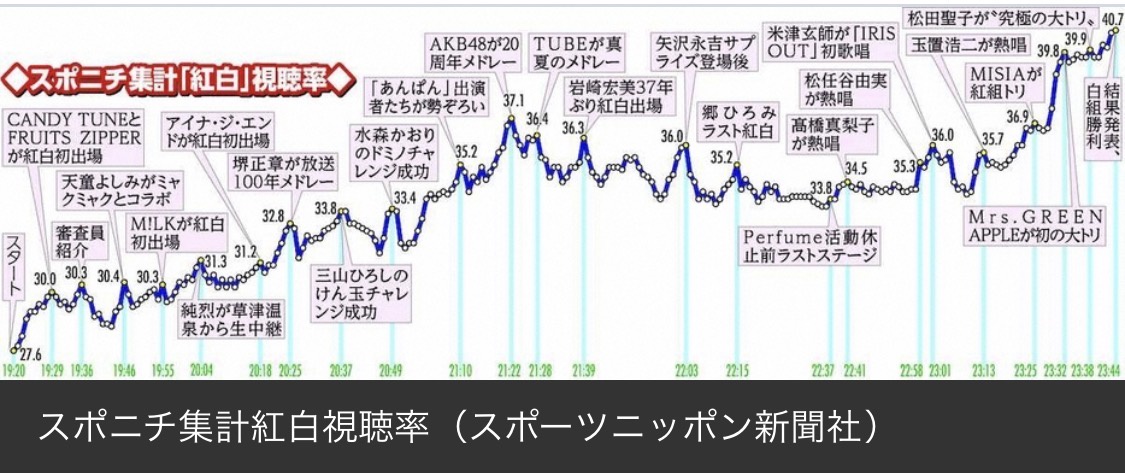 紅白は前回からターゲット層を中高年にシフトさせたことが、功を奏している。2年連続で平均視聴率を上げたことから、この傾向は続くとみられる。番組関係者は「その年のヒット曲を歌えば視聴率が上がる紅白ではなくなってきた。中高年に響く往年のヒット曲をどれだけ届けられるか」と今後の見通しを示した。