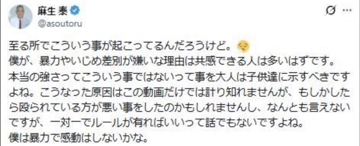 麻生氏は4日、当該動画について「至る所でこういう事が起こってるんだろうけど。僕が、暴力やいじめ差別が嫌いな理由は共感できる人は多いはずです」と切り出し、