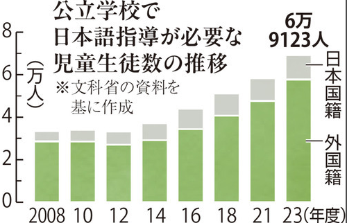 文部科学省によると、日本語指導が必要な児童生徒は2023年度、6万9123人(日本国籍含む)と過去最多を更新。この10年で約2倍に増えた。