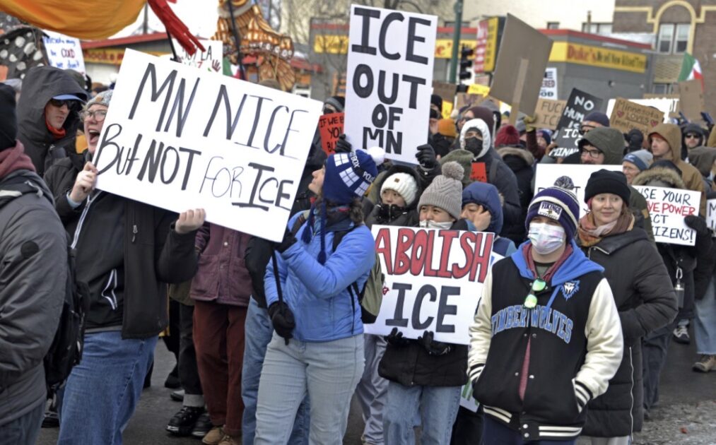 小雪の舞う氷点下のミネアポリスでは午後1時ごろ、レネ・グッドさん(37)が撃たれて亡くなった現場から数百メートル離れた公園を起点に、数万人が行進を開始した。