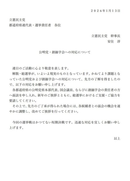 立憲民主党が23日召集予定の通常国会冒頭で衆院が解散された場合に備え、都道府県連代表らに対し、衆院選に向けて公明党の県本部代表らと支持母体・創価学会の責任者に支援を要請するよう求める文書を出したことがわかった。立憲の野田佳彦代表と公明の斉藤鉄夫代表は12日に会談し、「より高いレベルで連携」することで合意しており、それを受けた具体的な動きとなる。