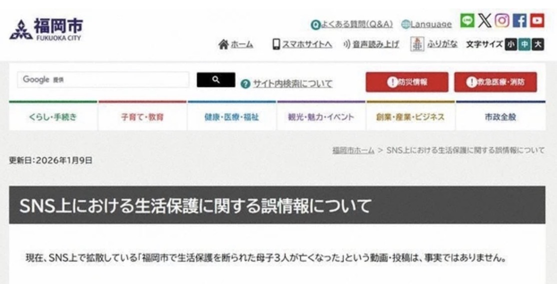 福岡市は個人情報保護の観点から生活保護の申請や受給は公表していない。市職員が8日にSNS上の誤情報を確認し、9日に事実ではないとHPで説明した。