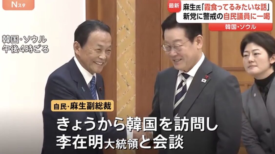 きょうから韓国を訪問している自民党の麻生副総裁は李在明大統領と会談したあと、取材に応じ、立憲民主党と公明党が新党を立ち上げたことで公明党の票が減るのではないかという懸念の声が自民党内の一部で上がっていることについて、次のように述べました。