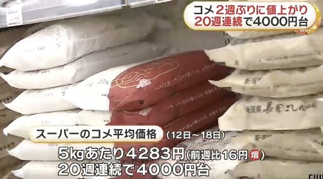コメの価格が2週ぶりに値上がりしました。農林水産省によりますと、1月18日までの1週間にスーパーで販売されたコメの平均価格(5kgあたり)は、前の週より16円高い4283円でした。