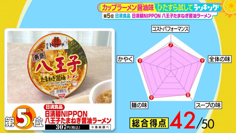 第5位は、日清食品の『日清麺NIPPON 八王子たまねぎ醤油ラーメン』(税込307円 ※番組調べ)。