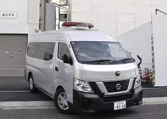 送検のため、留置施設を出るプロ野球広島の選手羽月隆太郎容疑者を乗せた車=29日午前9時22分、広島市中区