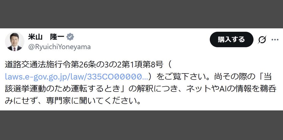 米山氏は続けて「尚その際の『当該選挙運動のため運転するとき』の解釈につき、ネットやAIの情報を鵜呑みにせず、専門家に聞いてください」と投げかけた。