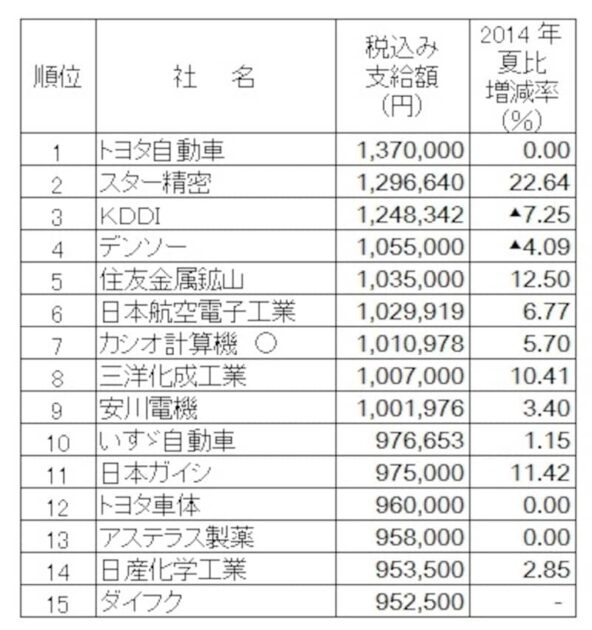 会社別:トップはトヨタ自動車の137万円