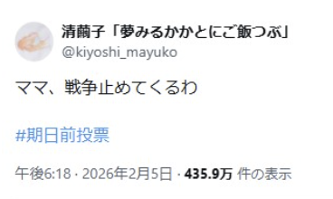 清さんは2月5日、自身のXに「ママ、戦争止めてくるわ」とポスト。「#期日前投票」とハッシュタグを添えた。この投稿が大きな反響を呼び、7日午前7時ごろの時点では表示回数約430万、コメント数は1100件超に達している。 このポストに対し「42歳で死ぬおもいで高齢出産した、ひとり息子を戦争に取られてたまるか!」「半世紀生きたおばちゃんも戦争を止めてきます!」「私も戦争とめてくるわ」「私も息子3人戦争には絶対やらないから止めてくるわ」「ママじゃなくても身近にいる子どもたちのために戦争止めてくるよ」「私も、戦争止めてくる!」「シングルマザーも戦争止めてくるわ」「戦争止めて来ます。子供たちのために」「母親だから、子供達の為に戦争止めてくる」などと同調するコメントが相次いで書き込まれた。