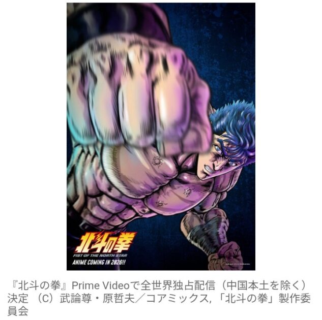 アニメ『北斗の拳 -FIST OF THE NORTH STAR-』(2026年放送・配信)が、Prime Videoで全世界独占配信(中国本土を除く)されることが決定した。