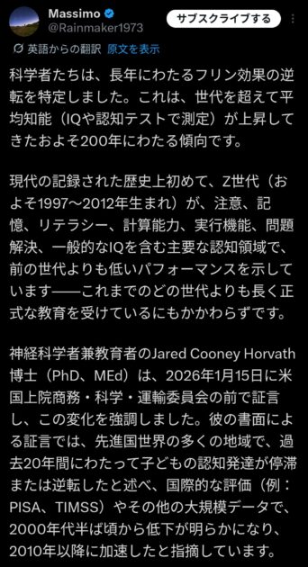引用元: ・過去200年間上昇し続けてきた若者の平均IQ、反転して下落開始 優れた教育を受けた「Z世代」がなぜ [237216734]