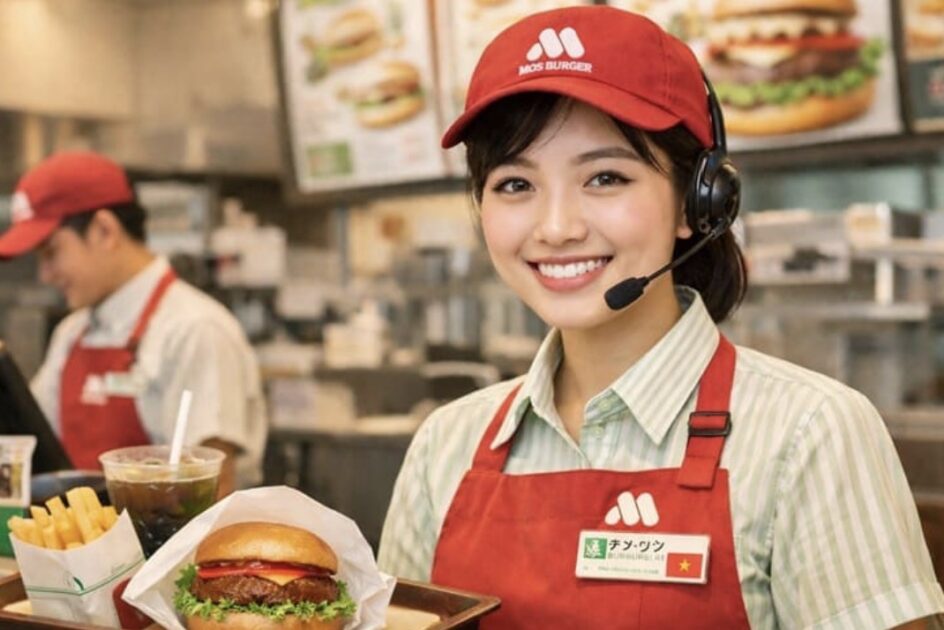 外食業界は深刻な人手不足に直面している。調理・接客の有効求人倍率は2倍を超え、2025年には飲食業倒産が過去最多を記録した。モスは2019年からベトナム国立ダナン短期大学と連携した独自プログラム「ベトナムカゾク」を実施。特定技能制度を活用し、来日後に正社員として店舗勤務から副店長・店長へ昇格を目指す。