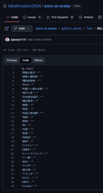 プログラムソースが開発プラットフォーム「GitHub(ギットハブ)」上に公開されており、その中の「NG.csv」というファイルに、「関東大震災」「朝鮮人犠牲者」「財源」「ワクチン」「温暖化」「外国人参政権」「原発」「核」「ヤ◯ザ」「Colabo」といった29の単語が登録されていた。