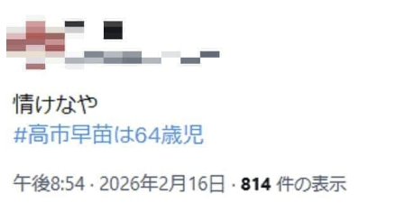 高市首相に対し、2月16日には、「情けなや #高市早苗は64歳児」と子ども扱いする投稿をして、その活動を嘆いた。