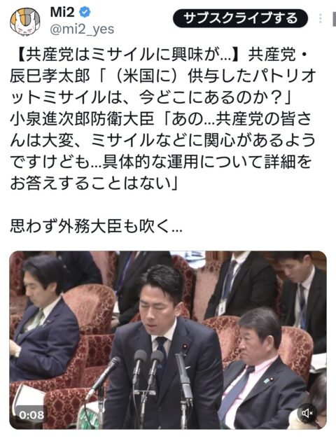 日本共産党「米国に供与したパトリオットミサイルは今どこにあるんだ」→小泉氏「😳??」