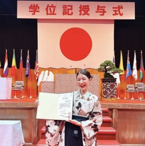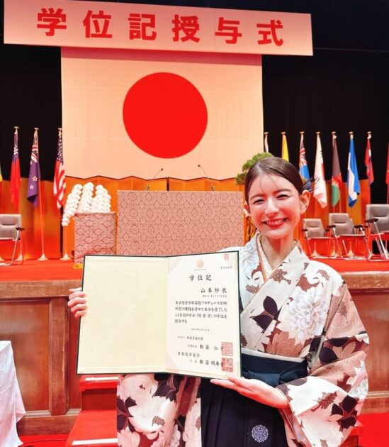 「日本経済大学を卒業しました」と学校名も明かし、日本経済大学の福岡キャンパスを位置情報にタグ付け。学位記授与式の思い出ショットをアップした。