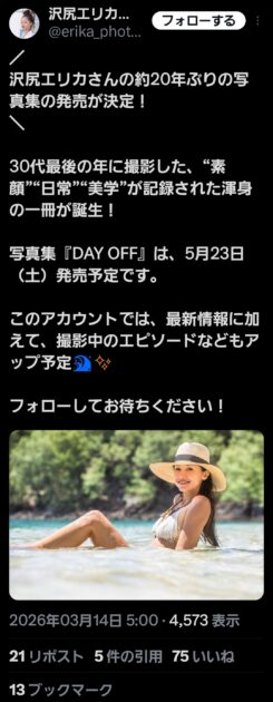 芸能界復帰から2年…。女優・沢尻エリカ(39)が披露したビキニショットがファンの目をさらっている。 5月23日に約20年ぶりとなる写真集「DAY OFF」を幻冬舎から発売する予定で、14日に開設された公式Xが誌面カットを公開した。