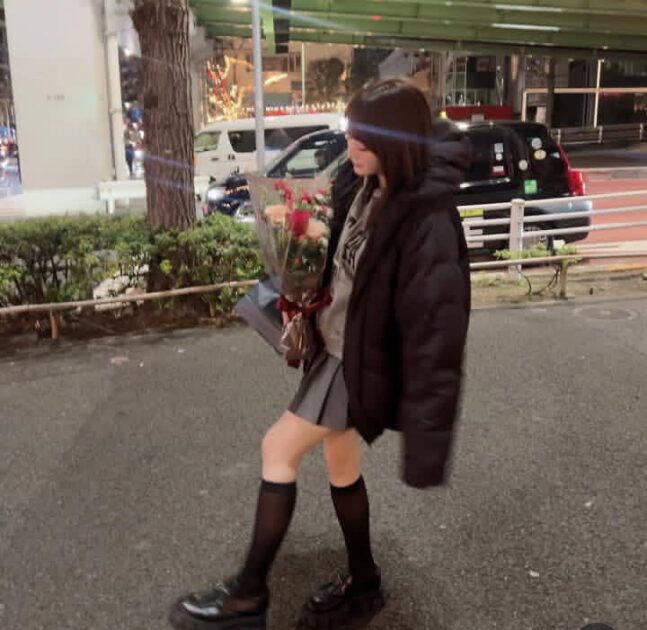 黒のダウンジャケットに、ミニ丈スカート、ハイソックスのコーディネートを披露。花束を持ち、笑顔を見せる姿を複数枚公開した。