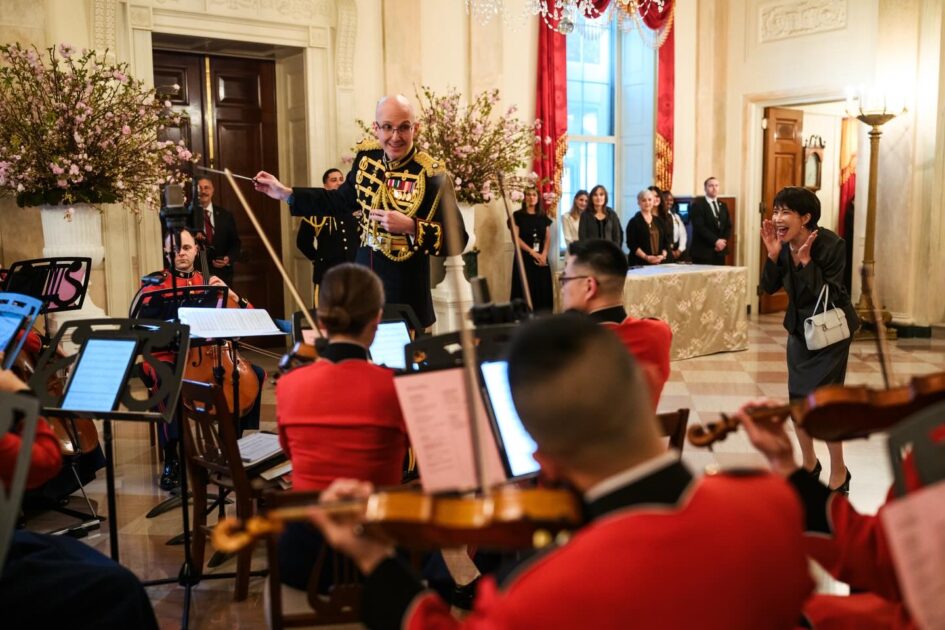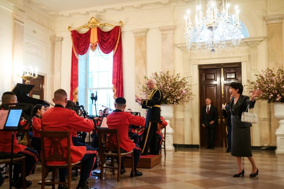 高市首相の後ろには赤いジャケットを身に着けた複数の米軍音楽隊が背を向けて鎮座。夕食会では、高市首相がかつてテレビ番組で熱唱した「X JAPAN」の「Rusty Nail」が演奏された。選曲はトランプ大統領だったという。
