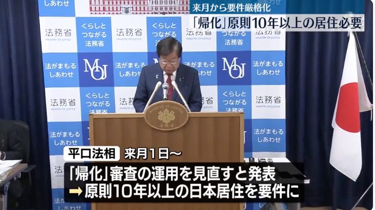 日本の国籍を取得する「帰化」について、来月1日から原則として10年以上日本に居住していることを要件に運用し、審査を厳格化すると明らかにしました。平口法相は27日の会見で、来月1日から「帰化」の審査に関する運用を見直し、原則として10年以上日本に居住していることを要件とすることを発表しました。