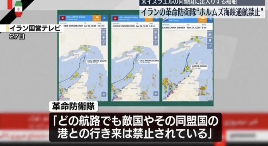 イランの革命防衛隊は27日、イランが事実上、封鎖しているホルムズ海峡について、アメリカやイスラエルの同盟国に出入りする船舶の通航を禁止すると警告しました。イランのメディアによりますと、革命防衛隊は27日、「どの航路を通った場合でも、敵国やその同盟国の港との行き来は、禁止されている」と警告しました。さらに、外国籍のコンテナ船3隻が27日朝、ホルムズ海峡を通過しようとしたものの、革命防衛隊側の警告により引き返したことを明らかにしました。