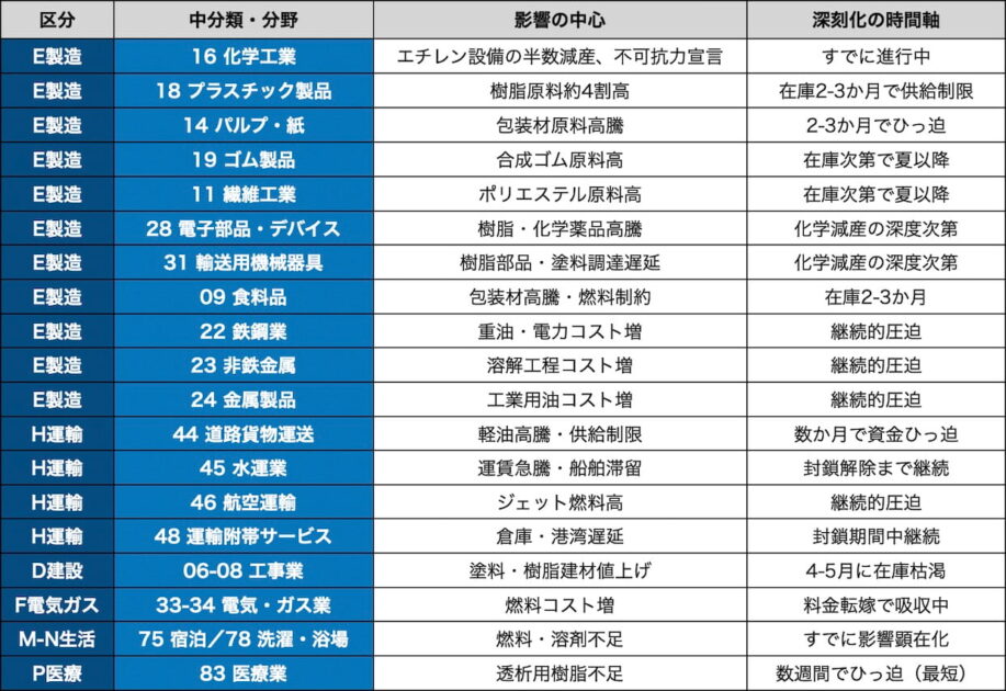 影響が確認された21の中分類と、次に波及が見込まれる予備軍を、深刻化の時間軸とともに整理した。