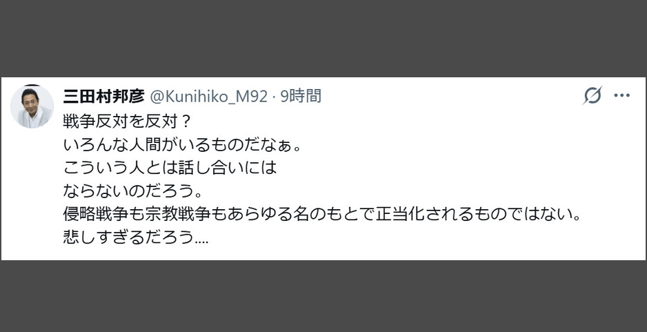 「戦争反対を反対?いろんな人間がいるものだなぁ。こういう人とは話し合いにはならないのだろう。侵略戦争も宗教戦争もあらゆる名のもとで正当化されるものではない。悲しすぎるだろう….」と述べた。
