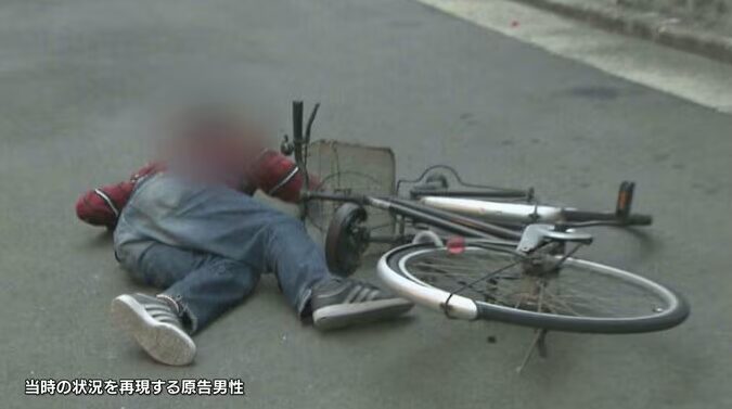 左折して坂道を下っていると、突然背後から、警察官に服の右脇腹あたりをつかまれ、バランスを崩して自転車ごと転倒。全身を強く打って、立ち上がることができなかったといいます。