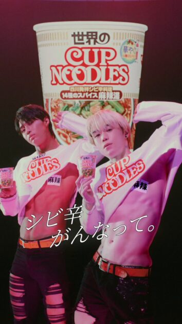 これは新商品「カップヌードル 14種のスパイス麻辣湯」のCMで、SHIROSEさんの楽曲「磁石」の替え歌にのせたもの。腹筋を強調するような衣服に身を包み、腰を振り、時には舌を出しながら、商品の特徴を訴求。途中には、観客席らしき場所から舞台上を眺める女性たちの姿も映っていた。